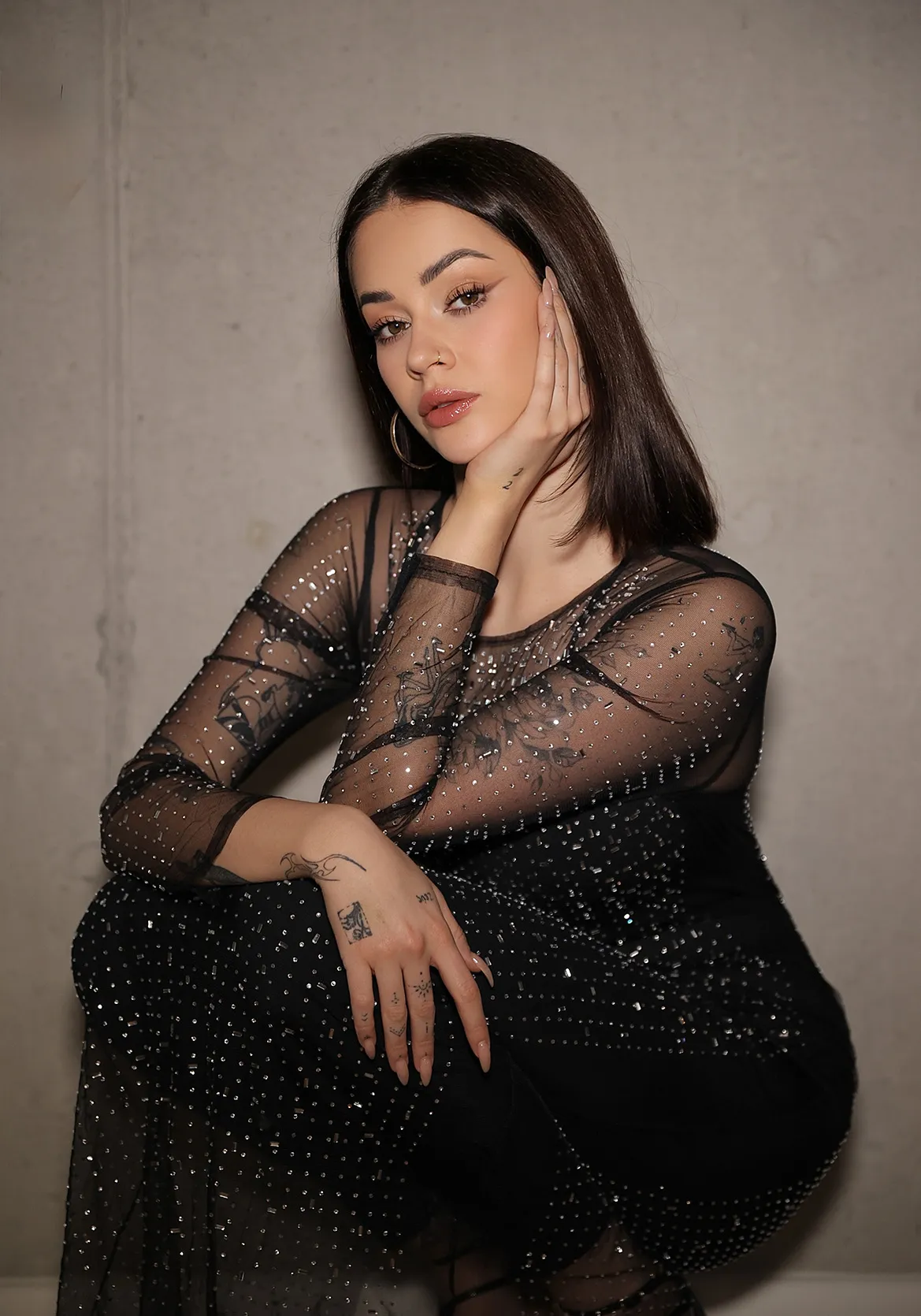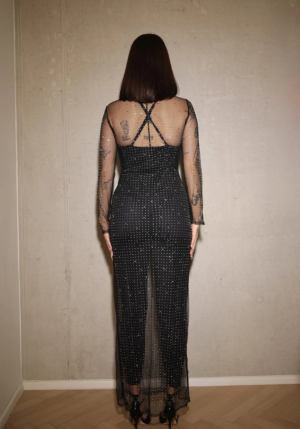 Unlike the other AMALU pieces designed as motion wear for full freedom of movement, the Sheer Crystal Dress is crafted primarily for evening styling. Its slightly relaxed fit allows it to drape elegantly over the body without fully hugging it, making it ideal for layering over slimmer pieces.